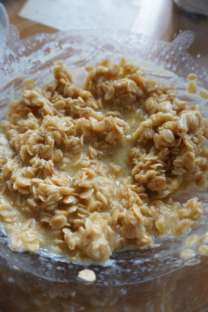 - In a medium mixing bowl, add oats to the melted butter. Stir to combine, and let soak for 1 hour.