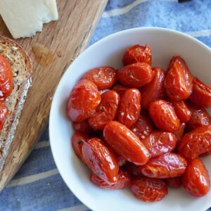 You can serve it with so many dishes too. Add these roasted grape tomatoes to an angel hair pasta, or top a flatbread with them. Serve them with eggs and toast…or make a breakfast bruschetta!